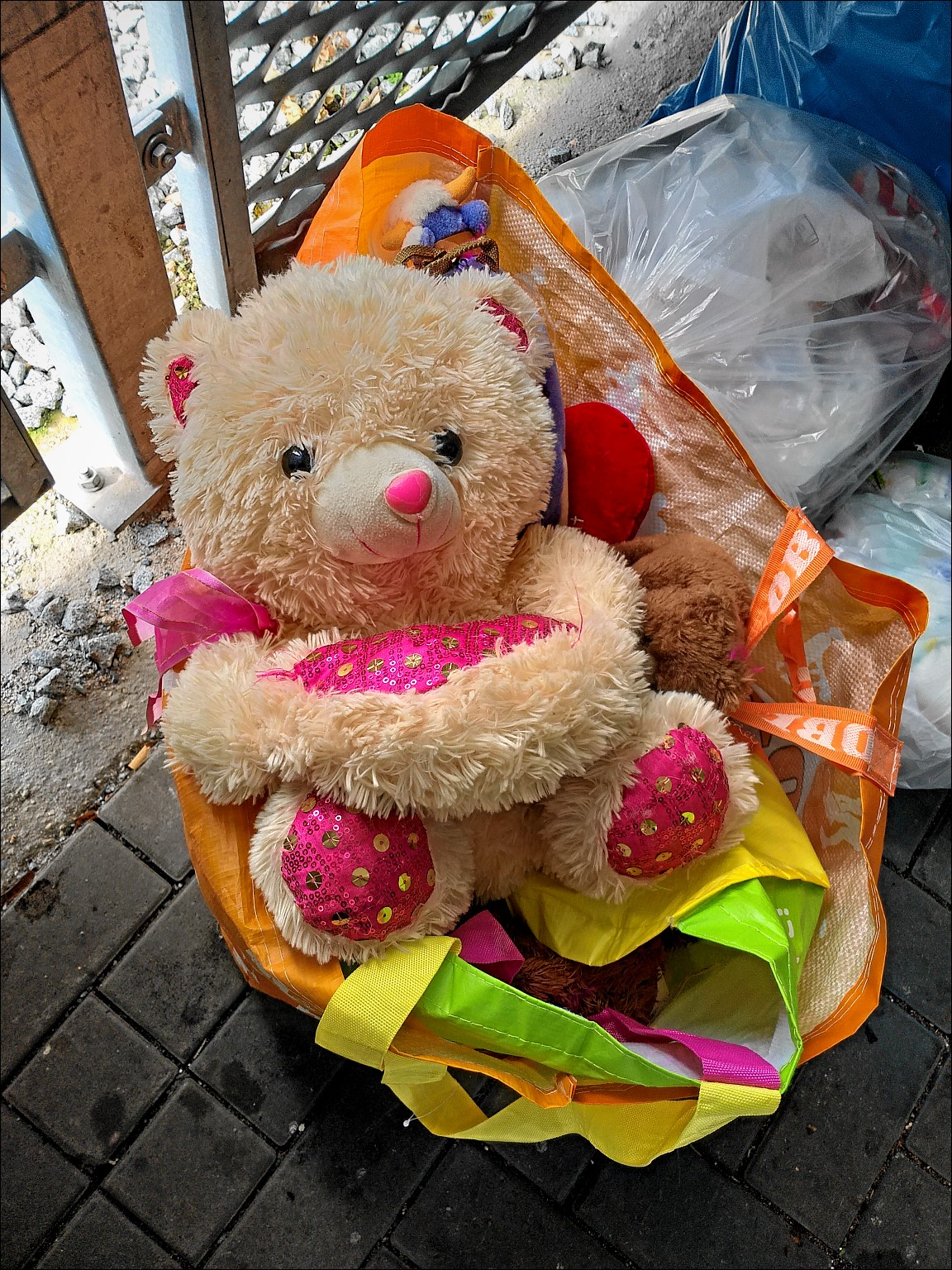 - Im nachbarschaftlichen Müllhaus mit allerlei Hausrat ausgesetzte Teddybärin